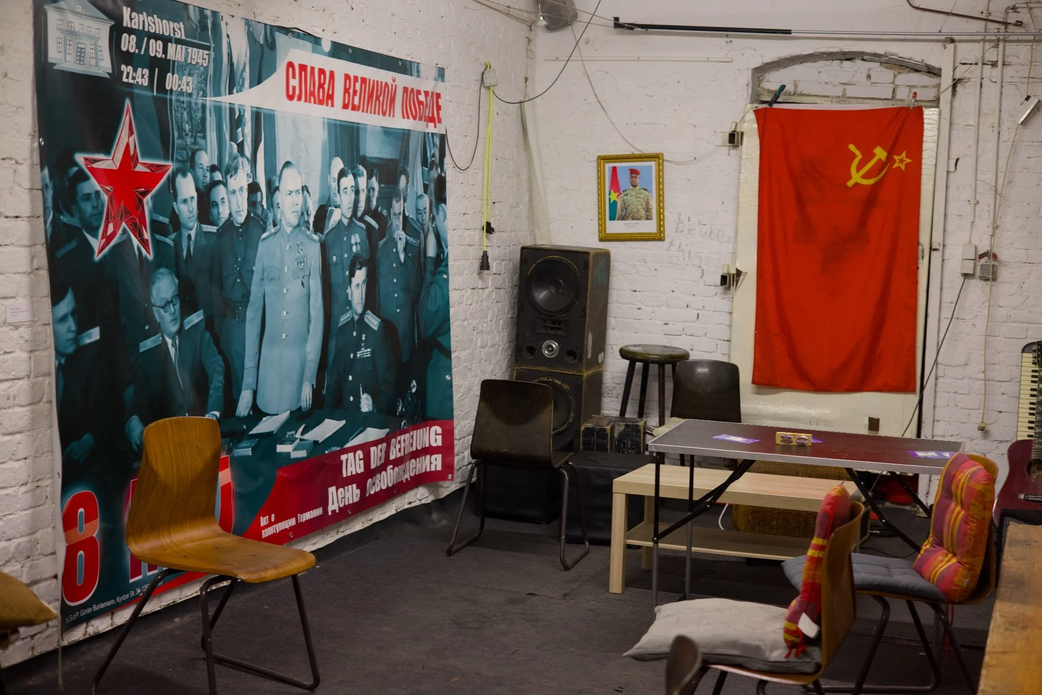 The Anti-War Café houses an anti-war museum in the basement, which is essentially a tribute to the victorious Soviet forces after World War II. The legendary image of the Red Army raising the flag over the burned-out Reichstag appears, and on the other side there’s the German surrender in Karlshorst on May 8, 1945. A Soviet flag hangs on the back wall. The message is enforced that the friendly Russian people brought peace to the Germans.