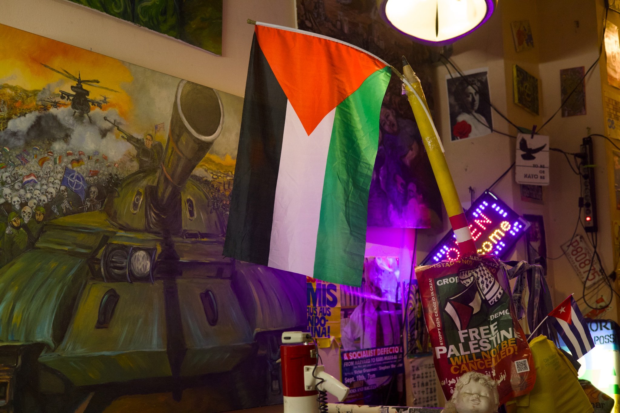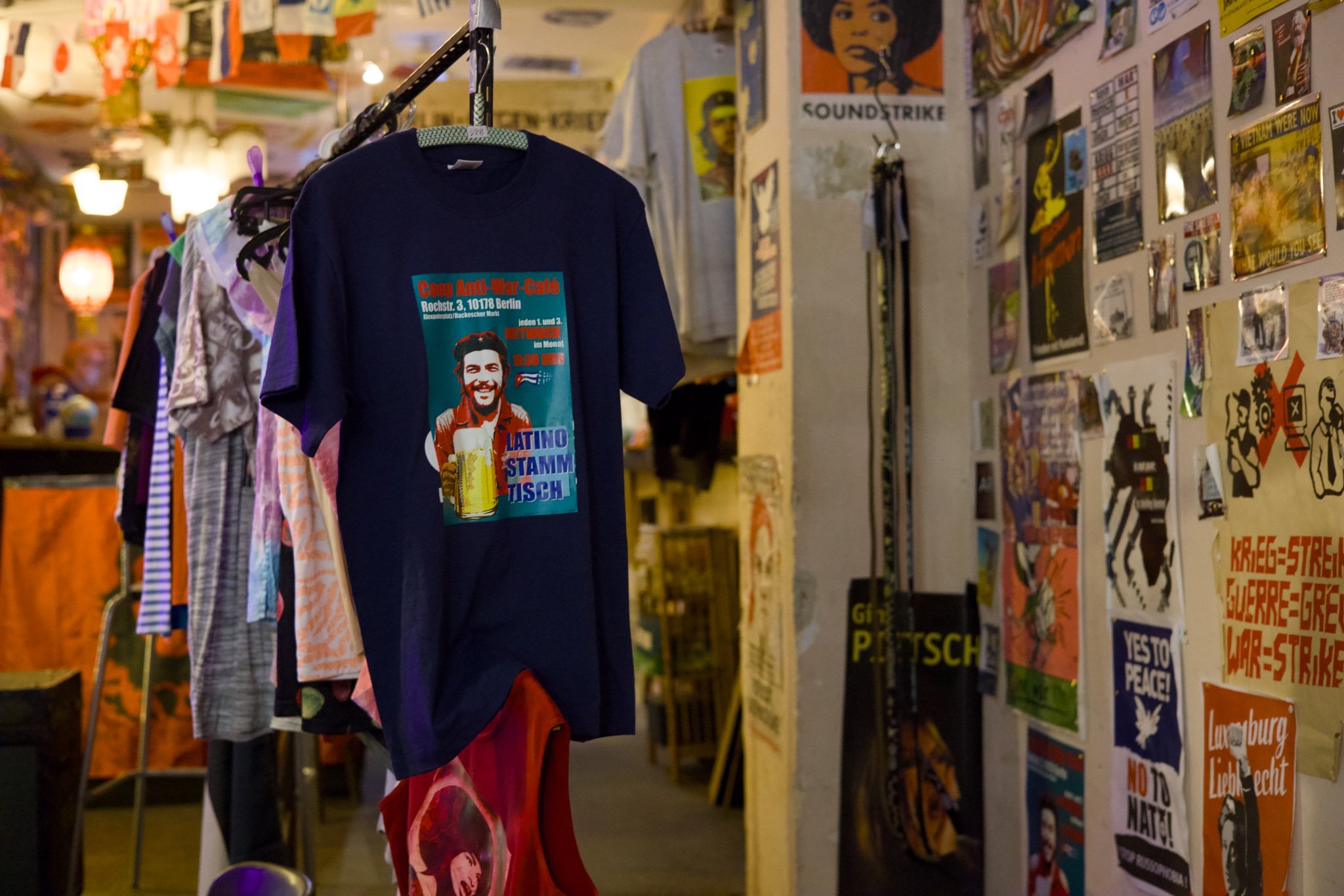 The Anti-War Café feels like a romantic throwback to the plenary room of a 1980s squat – the mist of alternative subculture lingers in the air. Upon entering the open area and climbing a ramp past T-shirts with protest slogans, you find the counter, a well-stocked fridge, and more posters, banners, placards, pennants, and wall decorations – as if an antifa demonstration had stormed the place and nailed all their protest gear to the walls and ceiling. Maybe they did.