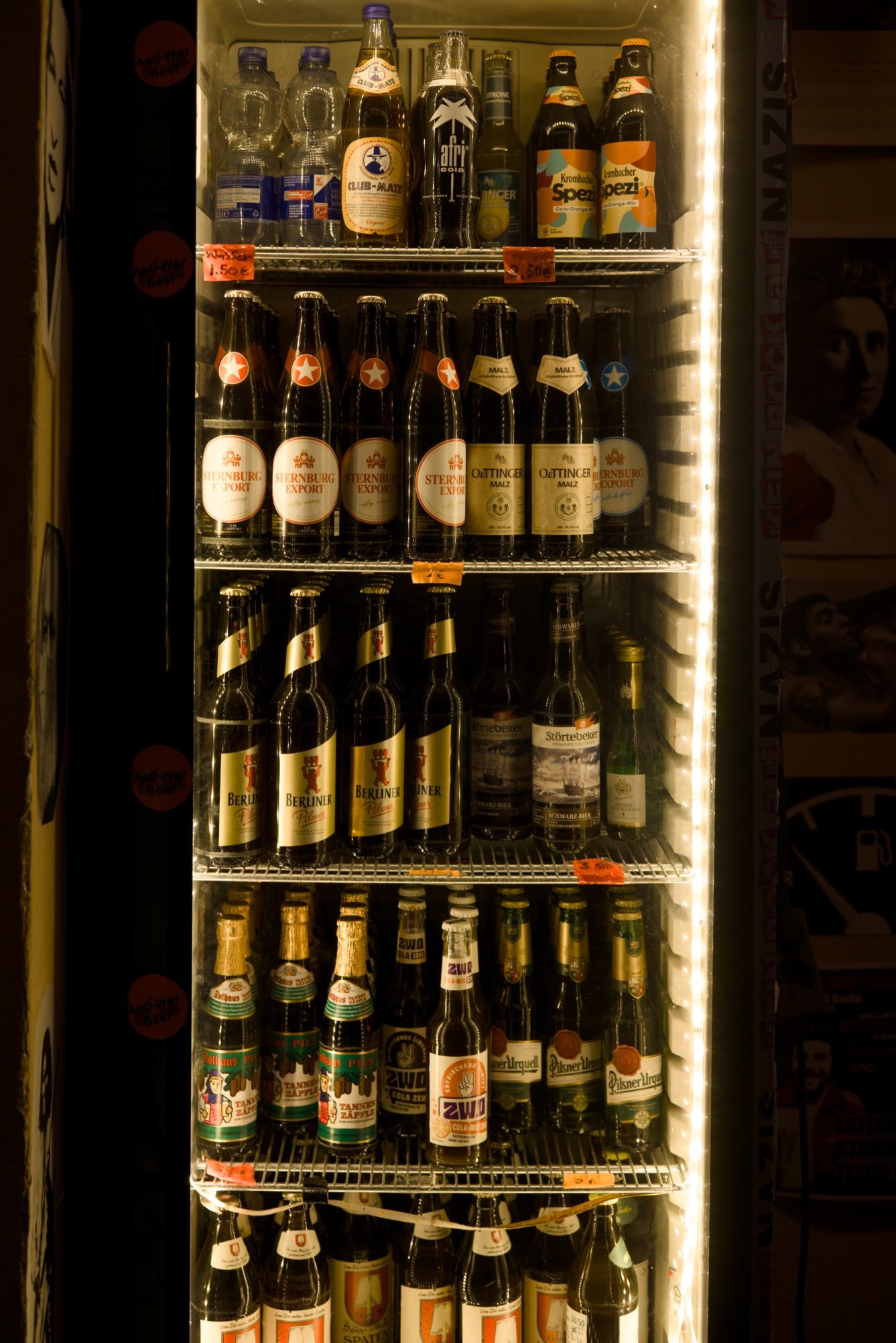 Tourists are welcome and lured by the very cheap beer. The selection is excellent. There’s Berliner, Störtebekker, Rothaus Pils, Spaten, Pilsner Urquell, Sterni and even alcohol-free Sterni for those who want to dodge the hangovers. Orange stickers label the booze “Anti War Beer” – this is where you can drink for peace!